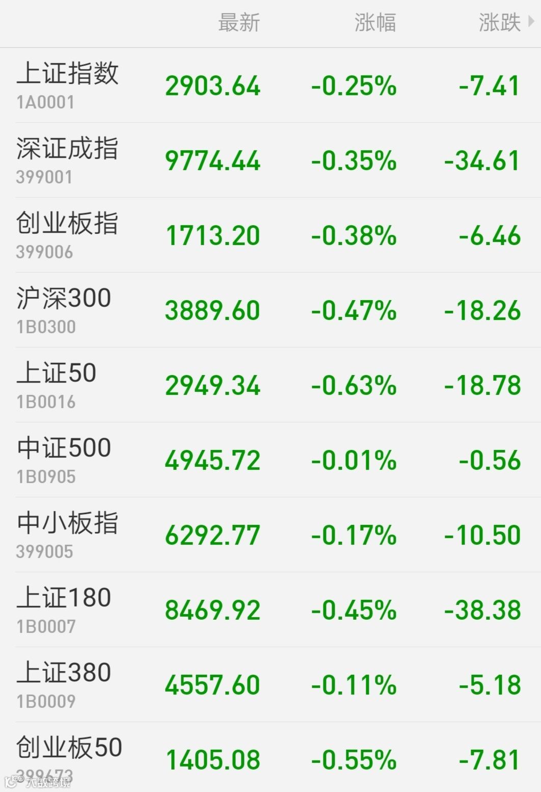1、A股:上证指数收跌0.25%报2903.64点,深证成指跌0.35%报9774.44点,创业板指跌0.38%报1713.2点,万得全A跌0.3%。两市缩量成交3610亿元,较上日同期缩量超600亿。军工股逆势走强,造纸、油化等部分超跌周期股展开反弹,电力板块较为活跃。