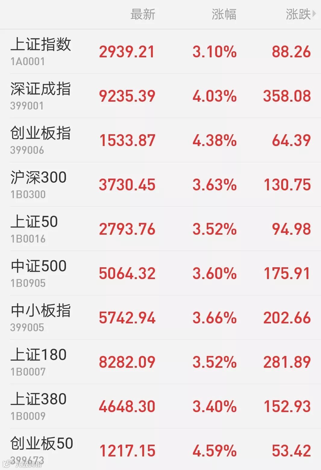 1、A股:A股上演绝地反击,走出V字反转行情,盘面再现百股涨停。上证综指收盘涨3.1%报2939.21点,创逾一个月最大升幅;深证成指、创业板指均涨逾4%。两市成交6102亿元,较上日放量明显。