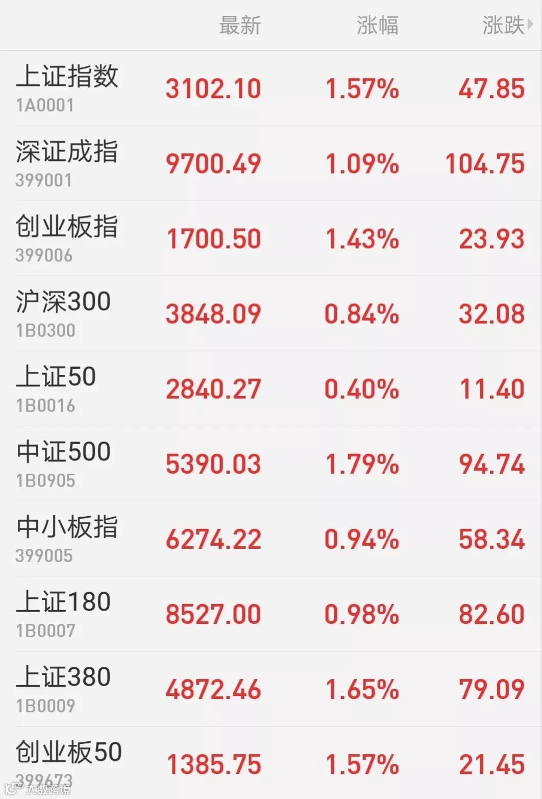 1、A股:券商股尾盘爆发,上证综指收涨1.57%报3102.1点,深证成指涨1.09%站上9700点,创业板指涨1.43%突破1700点,两市巨量成交1.11万亿元,为2015年11月以来新高;北上资金全天过山车大进大出,收盘净流出8亿元;场内连续两日超200股涨停。