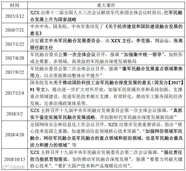根据以上梳理和分析,推测中央军民融合会议从18年开始在召开时间方面已进入常规化,军民融合会议已上升为国家战略,我们认为中央与各地方的军民融合会议类似于全国两会的模式,各地方先行组织,中央再集中召开。而19年的两会时间根据官方披露,预计与18年时间重合,所以我们推断19年第一次中央军民融合会议与18年相同,大概率会在全国两会前夕召开。