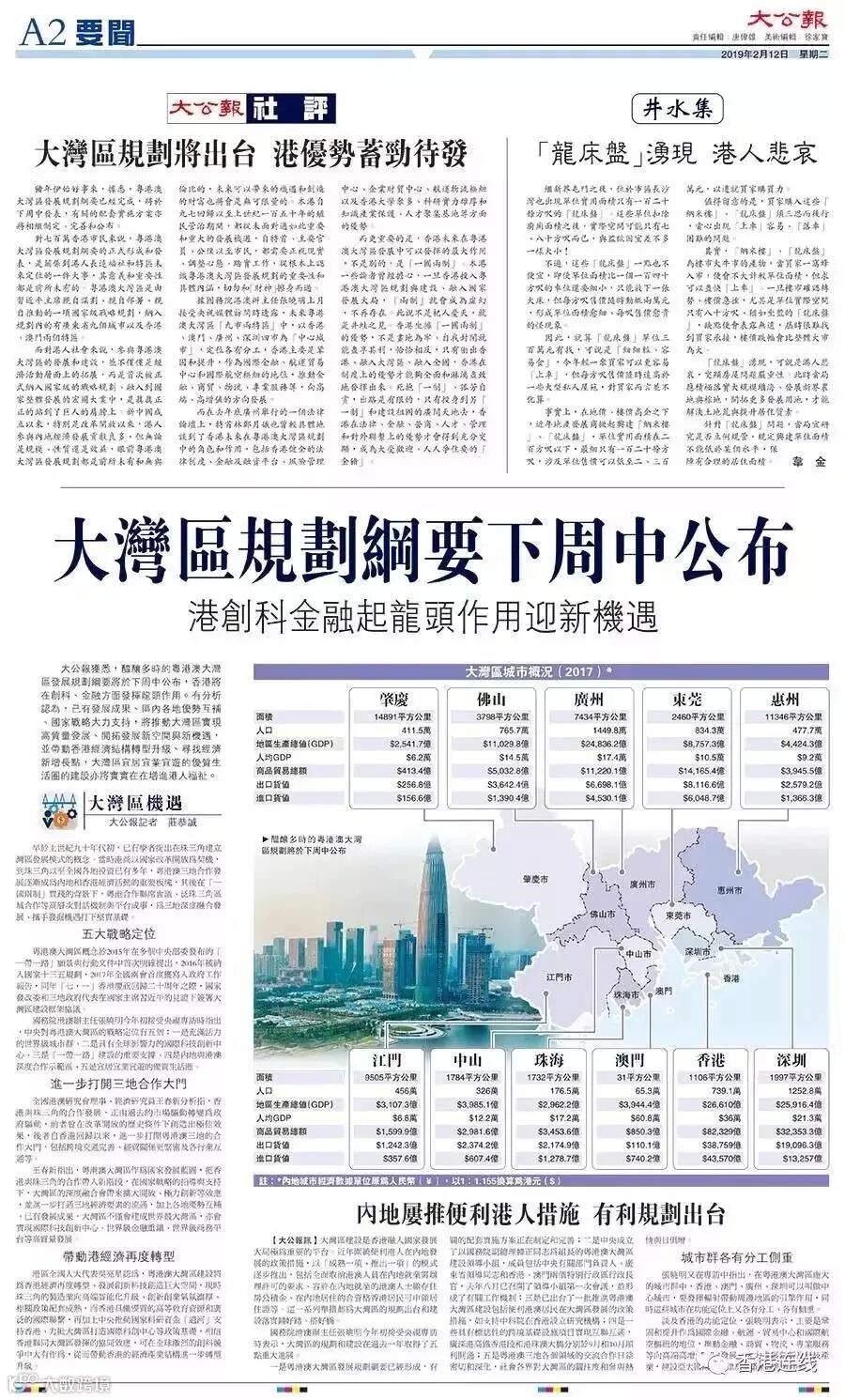 2019年2月12日,香港特区行政长官林郑月娥在出席行政会议前例行见记者时表示,粤港澳大湾区发展规划纲要有望在日内(下周中)由中央公布。香港特区政府计划联同广东省及澳门政府于2月21日在香港举行有关规划纲要的宣讲会,会上将共同探讨发展所带来的机遇,届时发改委高层亦将出席介绍规划纲要的内容。当日,大公报也对此事进行了大篇幅报道。这意味着酝酿多年的粤港澳大湾区规划即将进入到落地阶段。