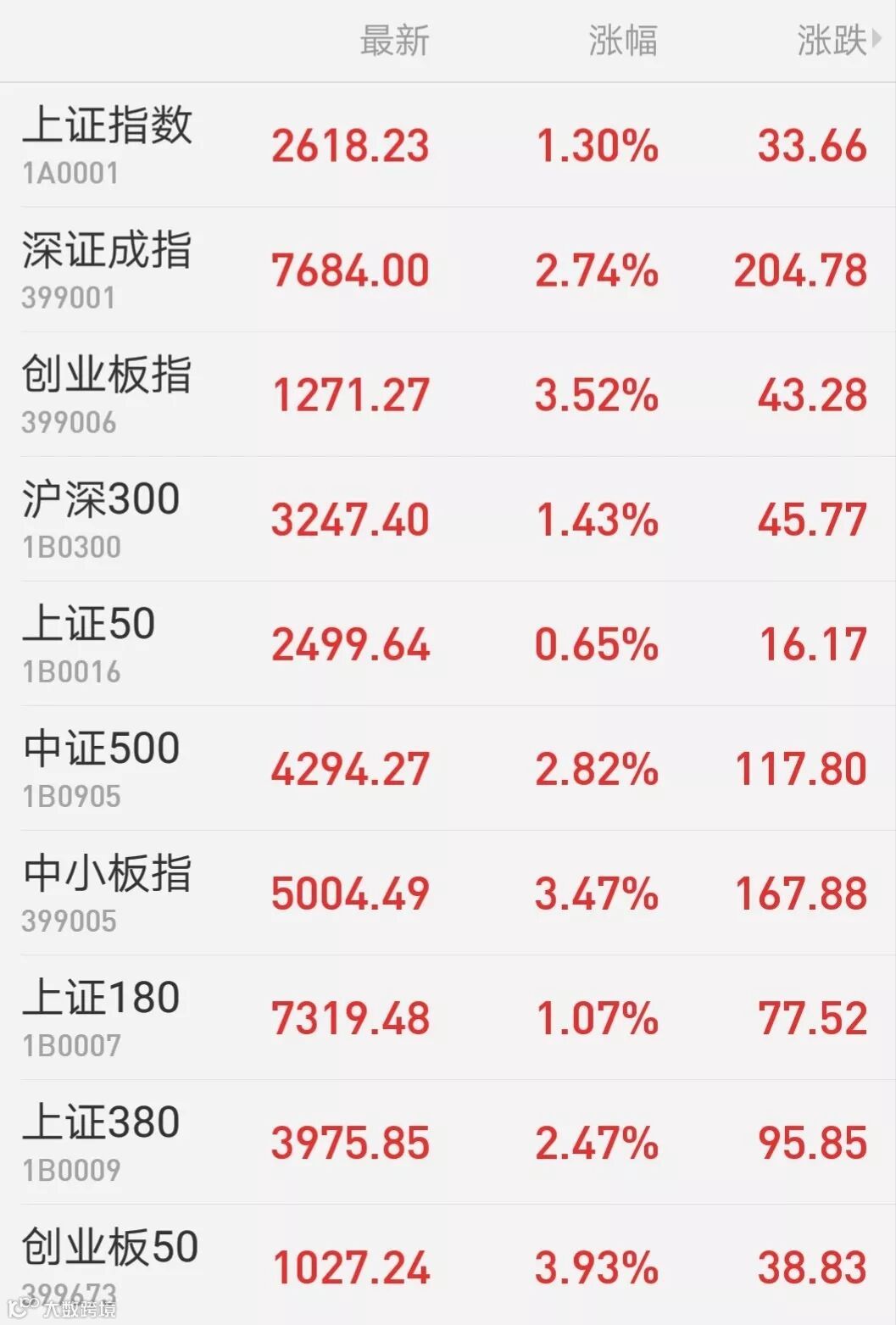 1、A股:A股全线飘红送别狗年,上证综指收涨1.3%报2618.23点,深证成指涨2.74%报7684点,创业板指大涨3.52%报1271.27点;中小板指站上5000点,万得全A收涨逾2%。两市成交2617亿元。板块方面,电气板块迎来涨停潮,科技股涨势强劲;医药、环保亦有强势表现;此前爆雷个股已多数止跌,天润数娱涨停。