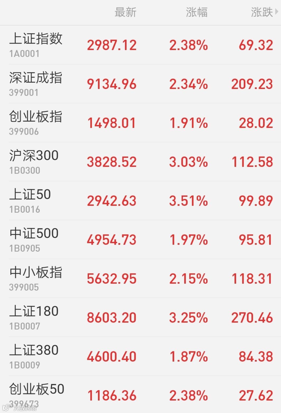 1、A股:A股强势上攻,上证综指收盘涨2.38%报2987.12点;深证成指涨2.34%;创业板指涨1.91%;上证50涨3.5%。两市成交额破6000亿,创一个多月来新高。北向资金净流入超55亿元,连续4日净流入。大金融全面爆发,券商领涨,中信建投、华林证券、哈投股份涨停。银行盘中崛起,紫金银行率先涨停。保险紧随其后,中国人保一度涨停,中国平安涨逾5%。多元金融同样大涨,安信信托、熊猫金控、陕国投A等集体封板。白酒表现出色,五粮液涨逾6%,股价创历史新高。垃圾分类概念再掀涨停潮,龙马环卫等逾10股涨停。午后工业大麻概念走强,顺灏股份、方盛制药涨停。尾盘石油行业崛起,洲际油气涨停。