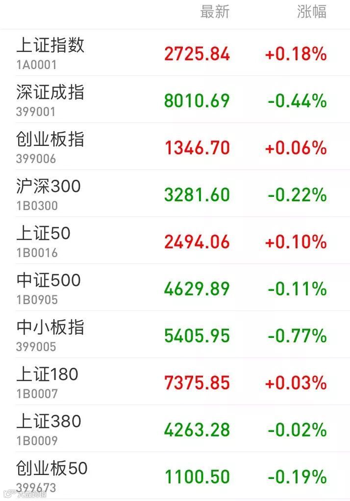 1、A股:上证指数报2725.84点,上涨0.18%,成交额1113.12亿。深证成指报8010.69点,下跌0.44%,成交额1247.27亿。创业板指报1346.70点,上涨0.06%,成交额361.89亿。两市合计成交2360.39亿。从盘面上看,环保工程、造纸印刷等板块涨幅居前。