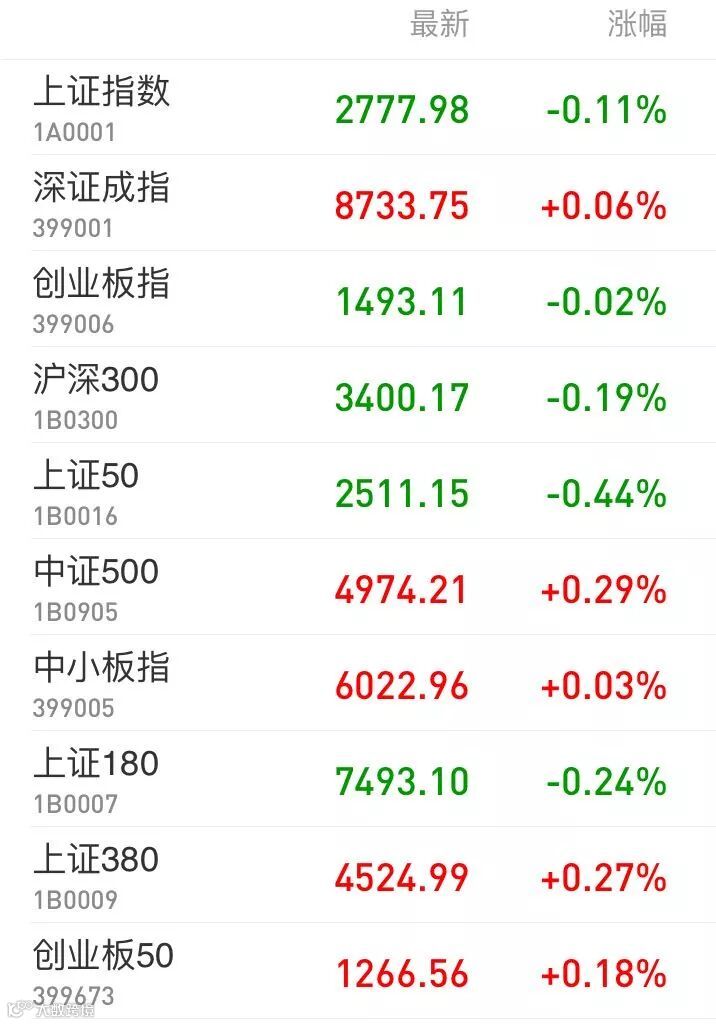 1、A股:上证指数报2777.98点,下跌0.11%,成交额1251.19亿。深证成指报8733.75点,上涨0.06%,成交额1663.34亿。创业板指报1493.11点,下跌0.02%,成交额510.22亿。两市合计成交2914.53亿。从盘面看,无人机、进口博览等板块涨幅居前。