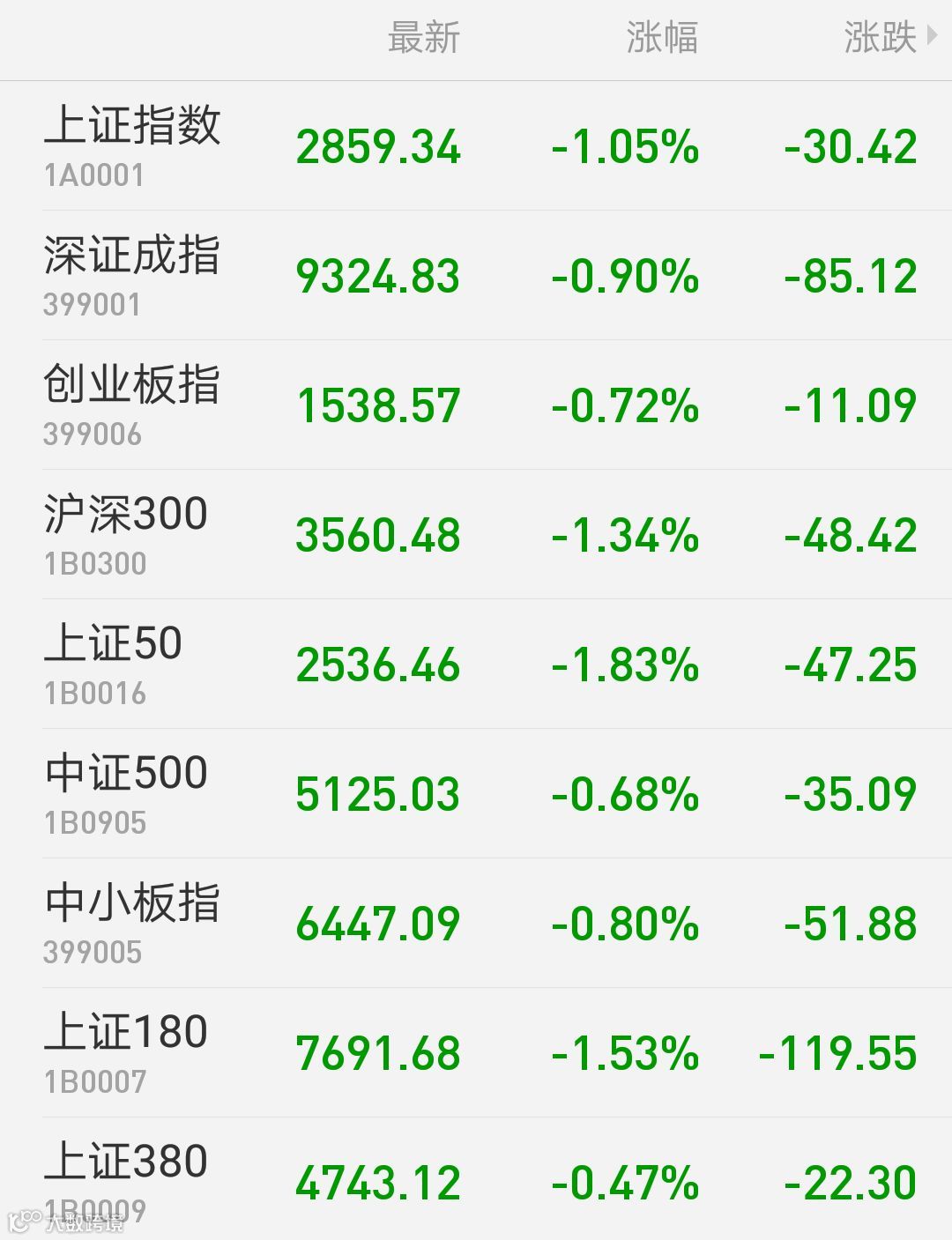 1、A股:上证指数报2859.34点,下跌1.05%,成交额1323.5亿;深证成指报9324.83点,下跌0.9%,成交额1755.54亿;创业板指报1538.57点,下跌0.72%,成交额581.30亿。两市合计成交3079.04亿。从盘面上看,工艺商品、酿酒行业等板块涨幅居前。