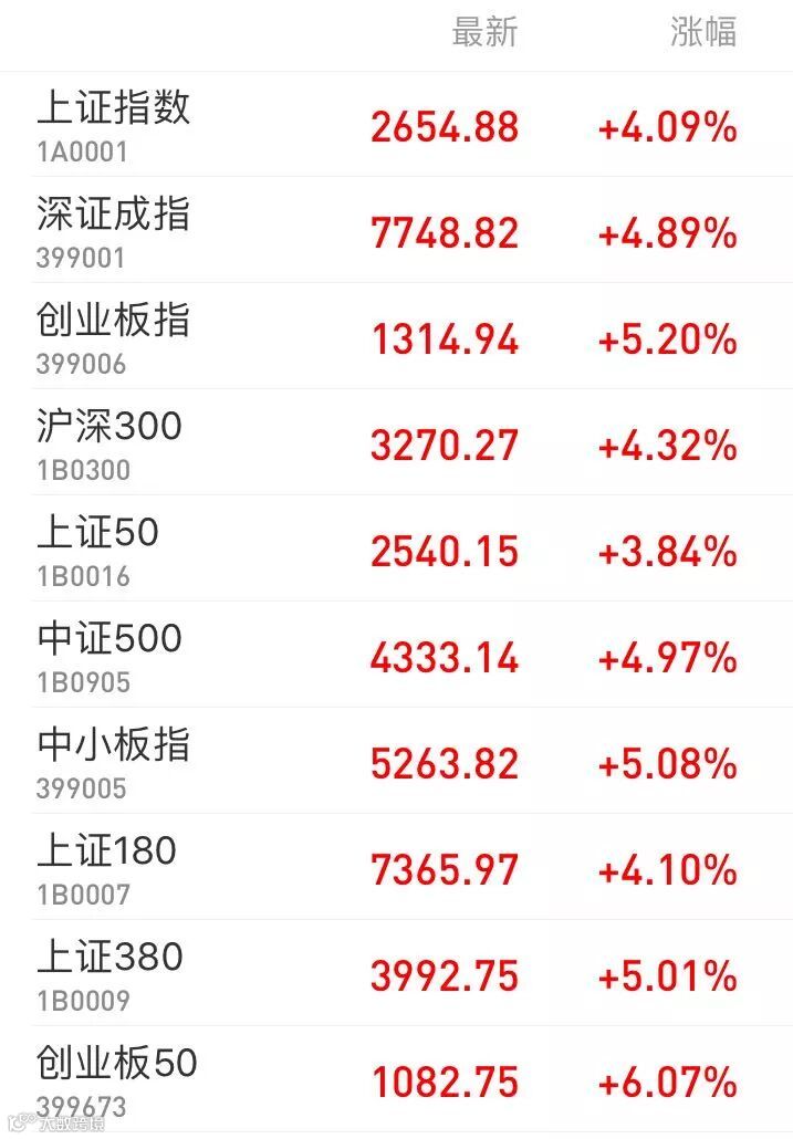 1、A股:上证综指涨超百点再收长阳,收报2654.88点,创逾两年半最大单日涨幅;深证成指涨4.89%报7748.82点,创业板指涨5.2%报1314.94点,万得全A收涨4.56%。两市巨量成交逾4200亿元,创近三个月最大。