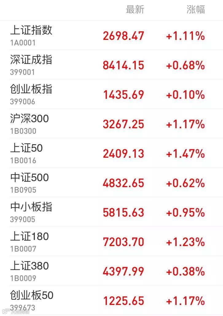 1、A股:上证指数报2698.47点,上涨1.11%,成交额1140.48亿。深证成指报8414.15点,上涨0.68%,成交额1506.95亿。创业板指报1435.69点,上涨0.1%,成交额494.03亿。两市合计成交2647.43亿。从盘面看,通讯行业、电信运营等板块涨幅居前。