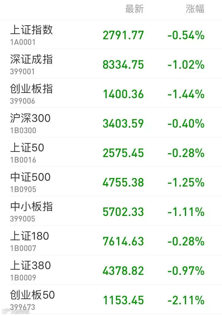 1、A股:上证指数报2791.77点,下跌0.54%,成交额1234.48亿。深证成指报8334.75点,下跌1.02%,成交额1625.86亿。创业板指报1400.36点,下跌1.44%,成交额495.14亿。两市合计成交2860.34亿。从盘面上看,仅有草甘膦、生物疫苗等板块上涨。