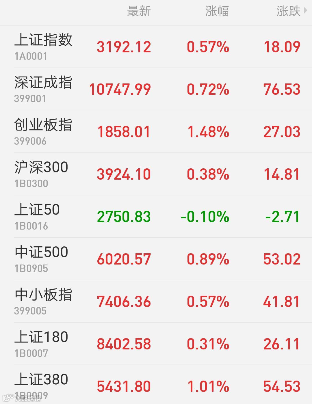1、A股:上证指数报3192.12点,上涨0.57%,成交额1629.91亿。深证成指报10747.99点,上涨0.72%,成交额2151.24亿。创业板指报1858.01点,上涨1.48%,成交额755.53亿。两市合计成交3781.15亿。从盘面上看,食品饮料、航天航空等板块涨幅居前。