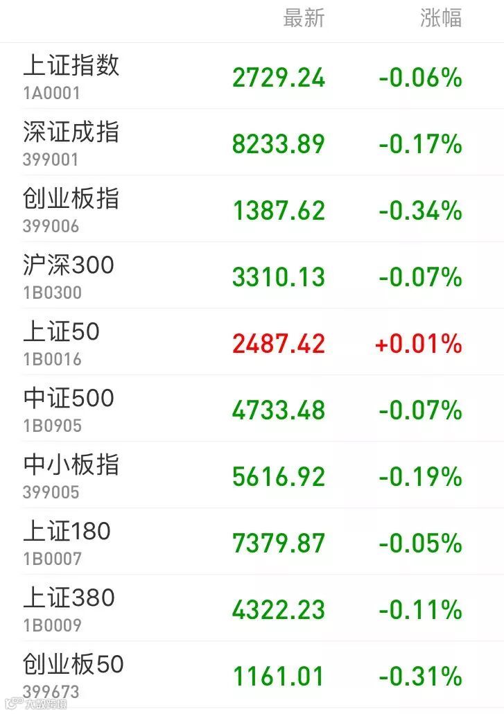 1、A股:上证指数报2729.24点,下跌0.06%,成交额1048.76亿。深证成指报8233.89点,下跌0.17%,成交额1455.33亿。创业板指报1387.62点,下跌0.34%,成交额413.76亿。两市合计成交2504.09亿。从盘面看,稀土永磁、水利建设等板块涨幅居前。