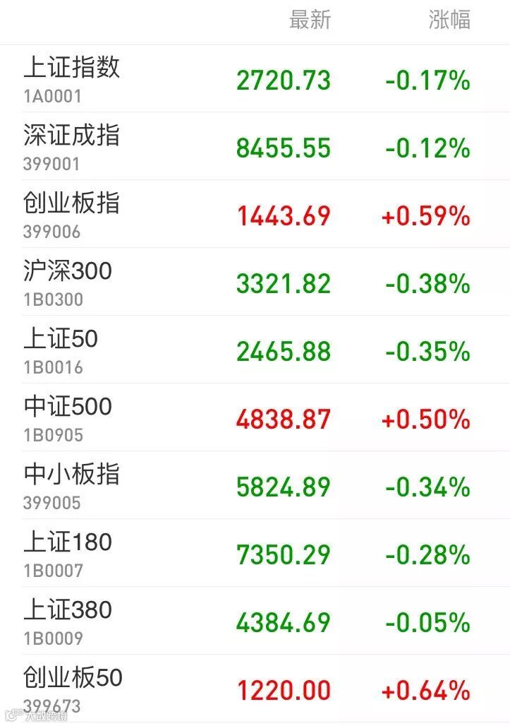 1、A股:上证指数报2720.73点,下跌0.17%,成交额1048.18亿。深证成指报8455.55点,下跌0.12%,成交额1382.21亿。创业板指报1443.69点,上涨0.59%,成交额437.60亿。两市合计成交2430.39亿。从盘面看,航天航空、农牧饲渔等板块涨幅居前。