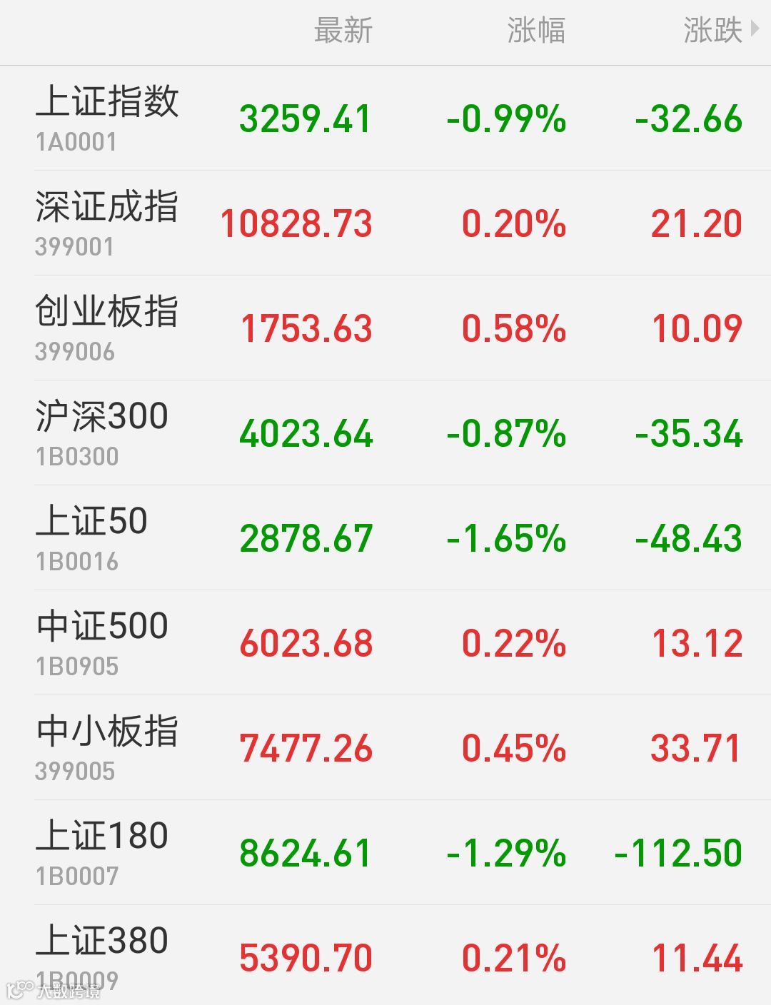1、A股:上证指数报3259.41点,下跌0.99%,成交额1802.34亿。深证成指报10828.73点,上涨0.20%,成交额2446.40亿。创业板指报1753.63点,上涨0.58%,成交额775.02亿。两市合计成交4248.74亿。2月,上证指数累计下跌6.36%,深证成指累计下跌2.97%,创业板指累计上涨1.07%。