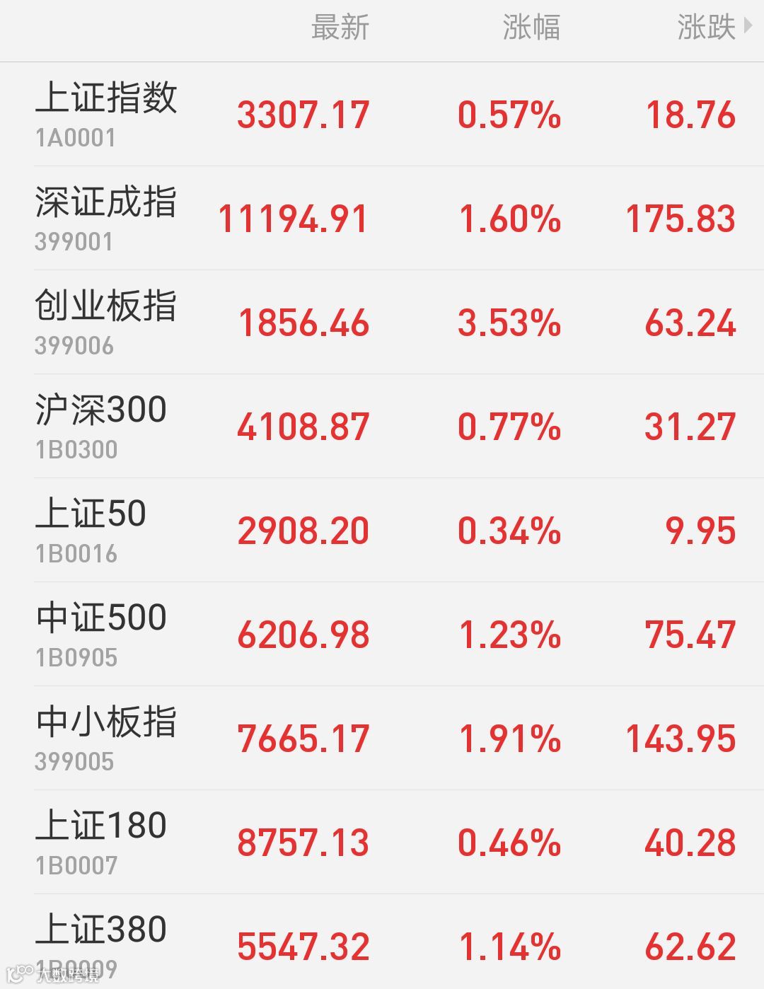 1、A股:上证指数报3307.17点,上涨0.57%,成交额2023.49亿。深证成指报11194.91点,上涨1.60%,成交额3096.72亿。创业板指报1856.46点,上涨3.53%,成交额1103.19亿。两市合计成交5120.21亿。从盘面上看,软件服务、电子信息等板块涨幅居前。