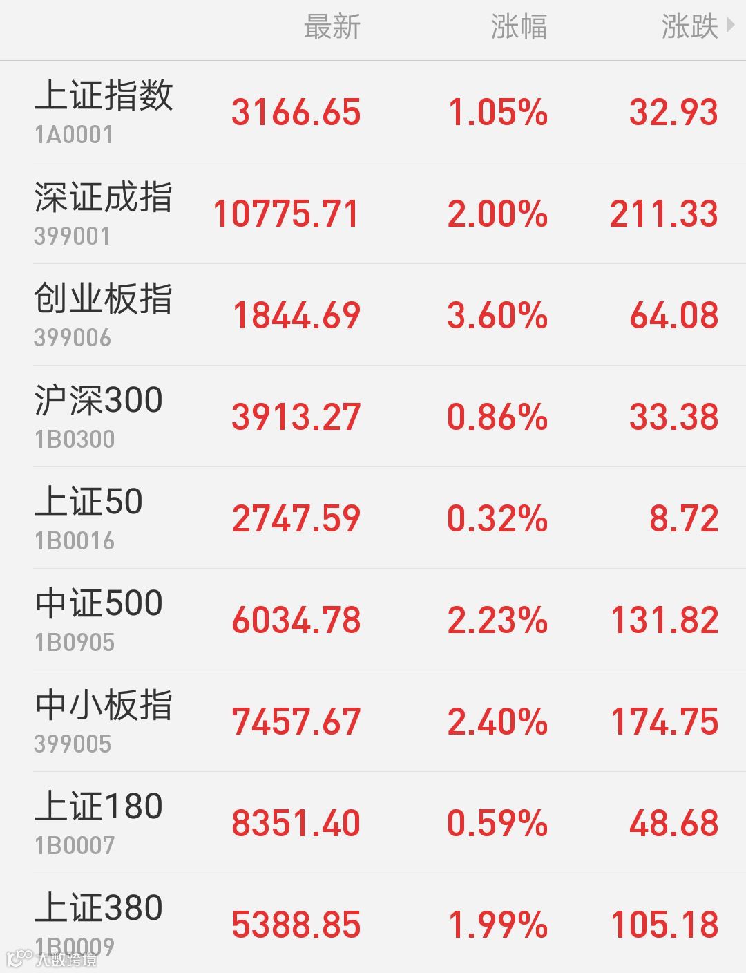 1、A股:上证指数报3166.65点,上涨1.05%,成交额2270.85亿。深证成指报10775.71点,上涨2%,成交额3133.18亿。创业板指报1844.69点,上涨3.60%,成交额1095.2亿。两市合计成交5404.03亿。从盘面上看,船舶制造、软件服务等板块涨幅居前。