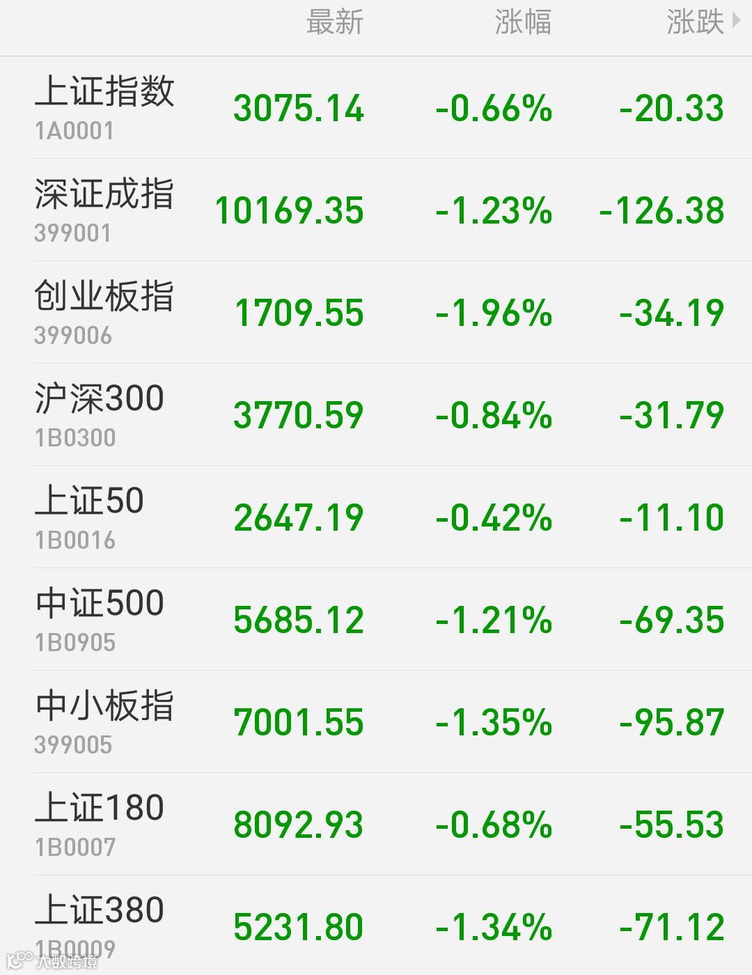 1、A股:上证指数报3075.14点,下跌0.66%,成交额1665.49亿。深证成指报10169.35点,下跌1.23%,成交额2089.86亿。创业板指报1709.55点,下跌1.96%,成交额665.34亿。两市合计成交3755.35亿。从盘面看,工艺商品、钛白粉等板块涨幅居前。