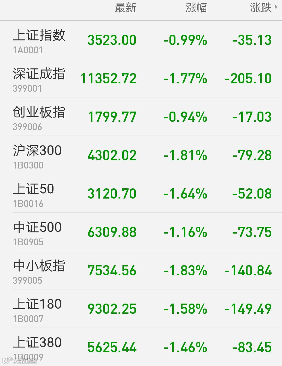 1、A股:上证指数报3523点,下跌0.99%,成交额2854.17亿。深证成指报11352.72点,下跌1.77%,成交额2699.42亿。创业板指报1799.77点,下跌0.94%,成交额729.89亿。两市合计成交5553.59亿。从盘面上看,煤炭采选、钢铁行业等板块涨幅居前。