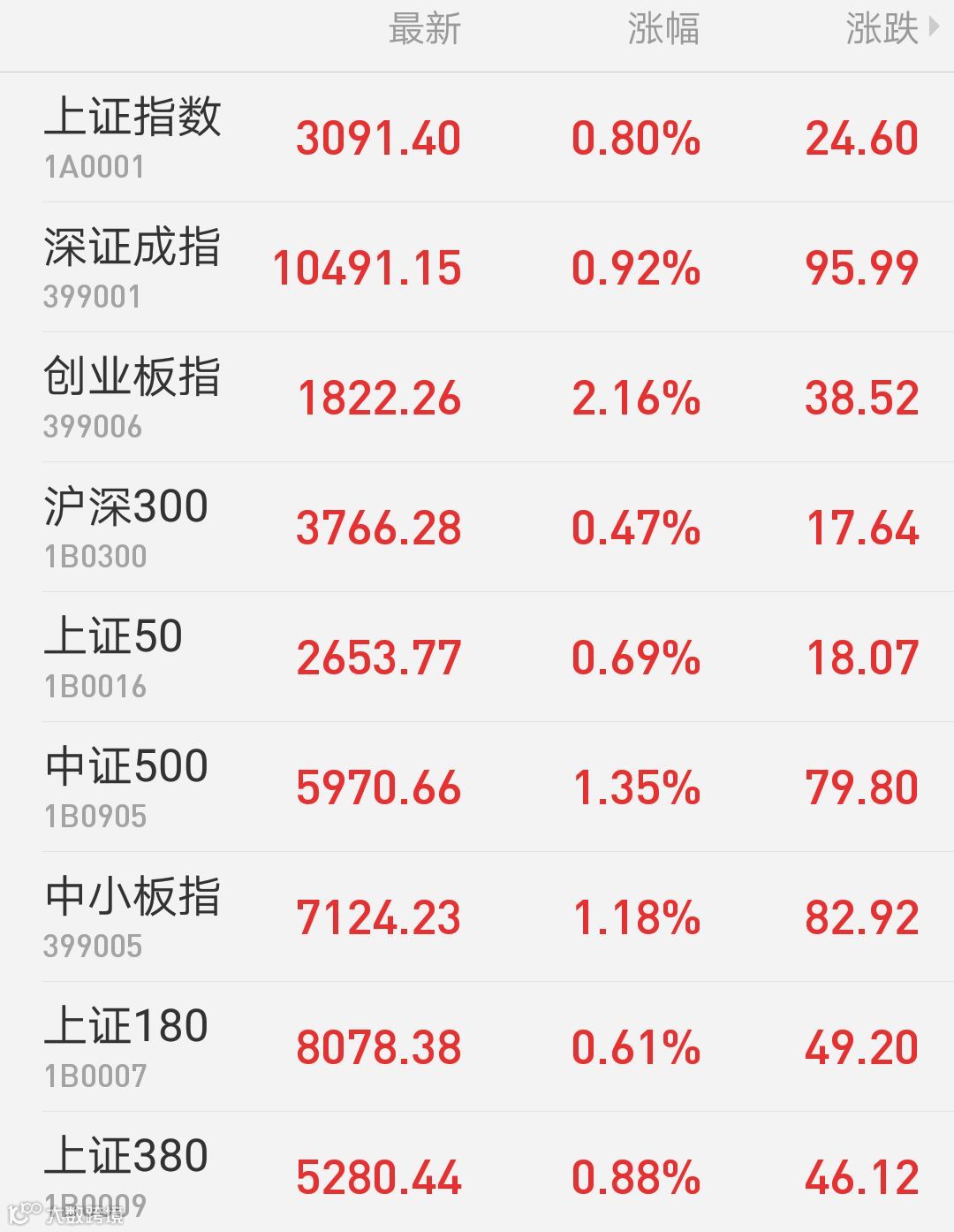 1、A股:上证指数报3091.4点,上涨0.8%,成交额2022.39亿,盘中触及3041.63,创11个月以来低点。深证成指报10491.15点,上涨0.92%,成交额2922.87亿。创业板指报1822.26点,上涨2.16%,成交额1067.36亿。两市合计成交4945.26亿。从盘面上看,芯片概念、网络安全、卫星导航等板块涨幅居前。