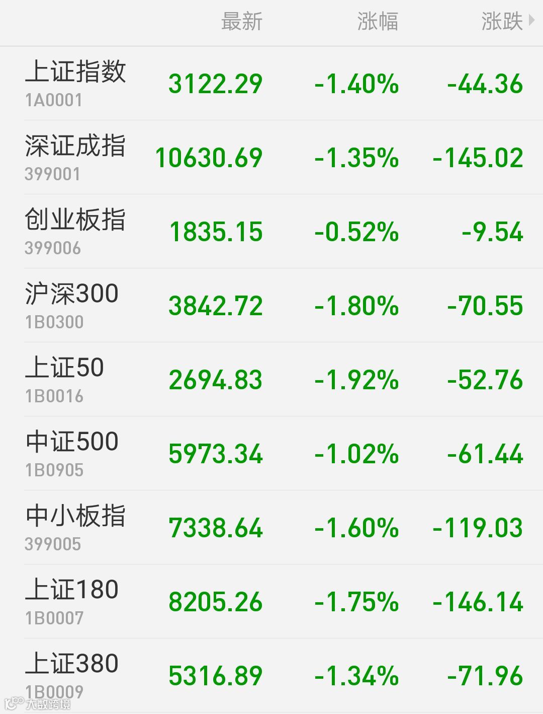 1、A股:上证指数报3122.29点,下跌1.4%,成交额2086.18亿。深证成指报10630.69点,下跌1.35%,成交额2911.96亿。创业板指报1835.15点,下跌0.52%,成交额1084.98亿。两市合计成交4998.14亿。从盘面上看,基因测序、免疫治疗等板块涨幅居前。