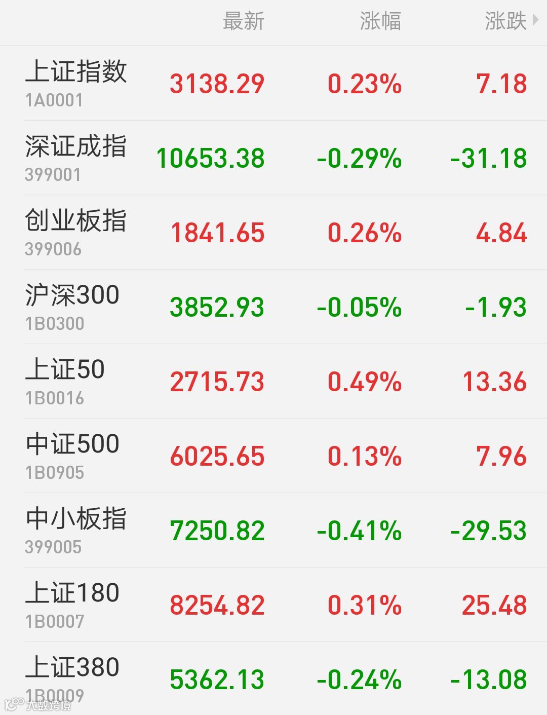 1、A股:上证指数报3138.29点,上涨0.23%,成交额1772.37亿。深证成指报10653.38点,下跌0.29%,成交额2595.79亿。创业板指报1841.65点,上涨0.26%,成交额933.59亿。两市合计成交4368.16亿。从盘面上看,航天航空、港口水运等板块涨幅居前。