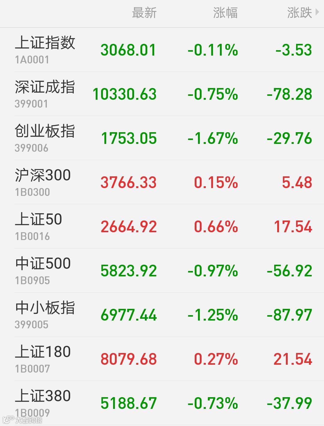 1、A股:上证指数报3068.01点,下跌0.11%,成交额1578.55亿。深证成指报10330.63点,下跌0.75%,成交额2359.47亿。创业板指报1753.05点,下跌1.67%,成交额843.13亿。两市合计成交3938.02亿。从盘面上看,电信运营、保险等板块涨幅居前。