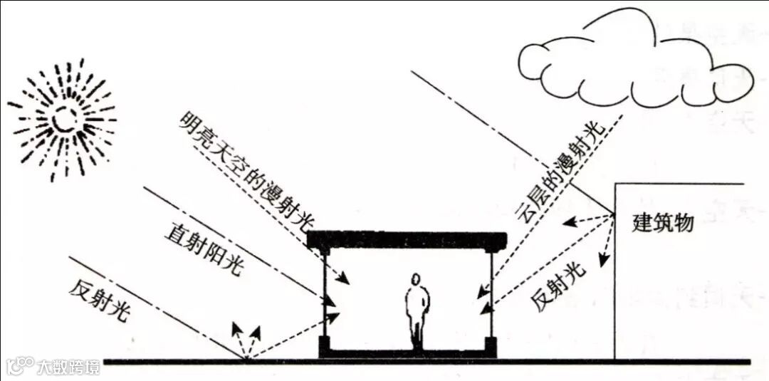 天空漫射光:太阳光穿过大气层时,碰到大气层中空气分子、灰尘、水蒸气等微粒,产生多次反射,形成天空扩散光。天空扩散光使天空具有一定的亮度,无方向、不形成阴影;