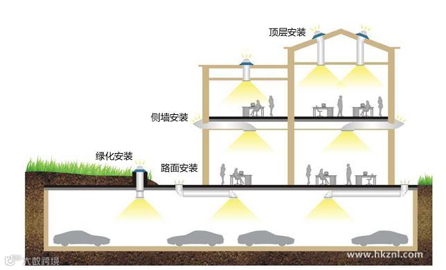 导光筒:用导光管将太阳集光器收集的光纤传送到室内需要采光的地方,很多项目的地下室采光都是通过导光筒的方式实现。导光筒通常可以布置在屋顶、建筑侧墙、路面和绿化带中。