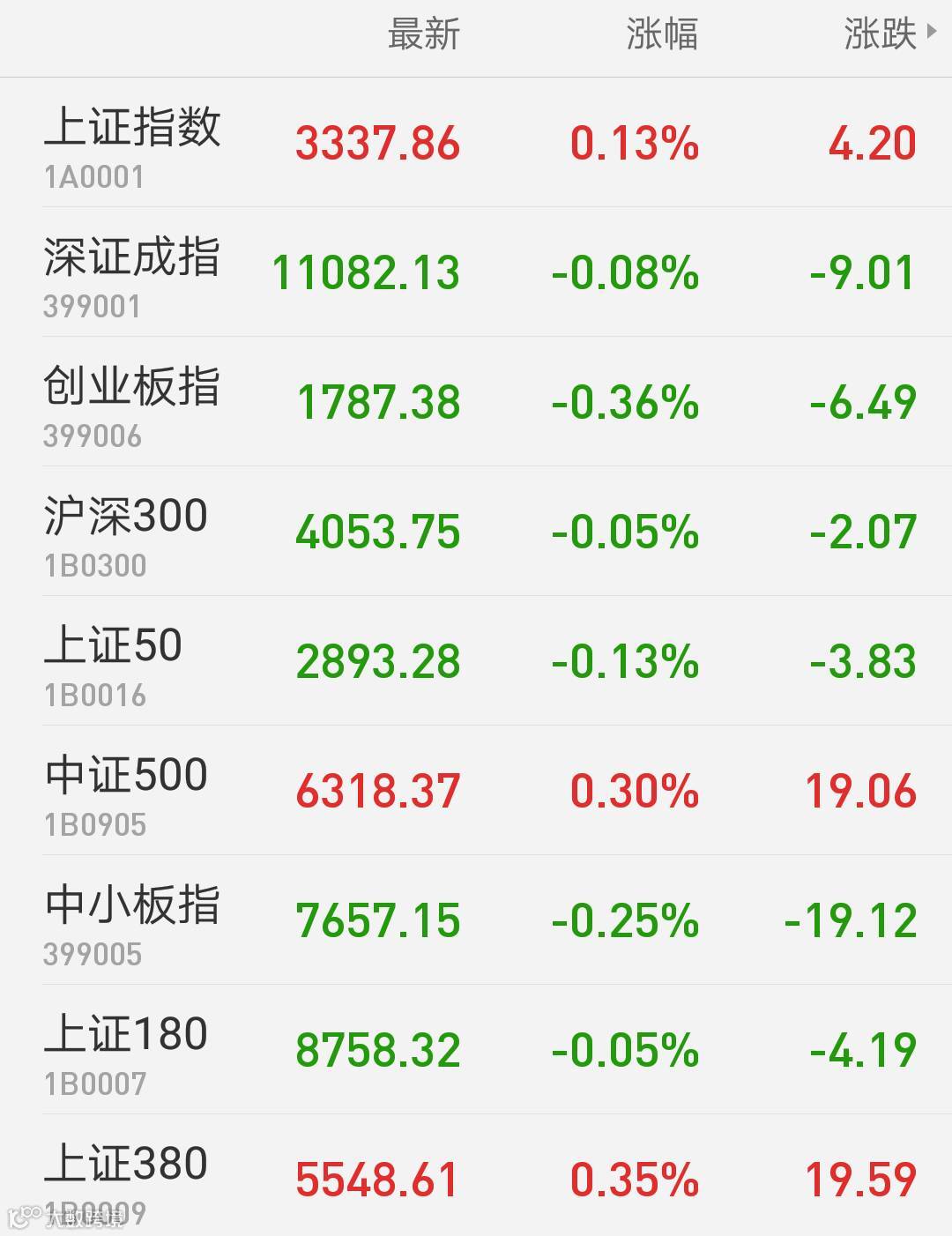1、A股:上证指数报3337.86点,上涨0.13%,成交额2177.69亿。深证成指报11082.13点,下跌0.08%,成交额2393.04亿。创业板指报1787.38点,下跌0.36%,成交额571.56亿。两市合计成交4570.73亿。从盘面上看,高送转、水泥建材等板块涨幅居前。