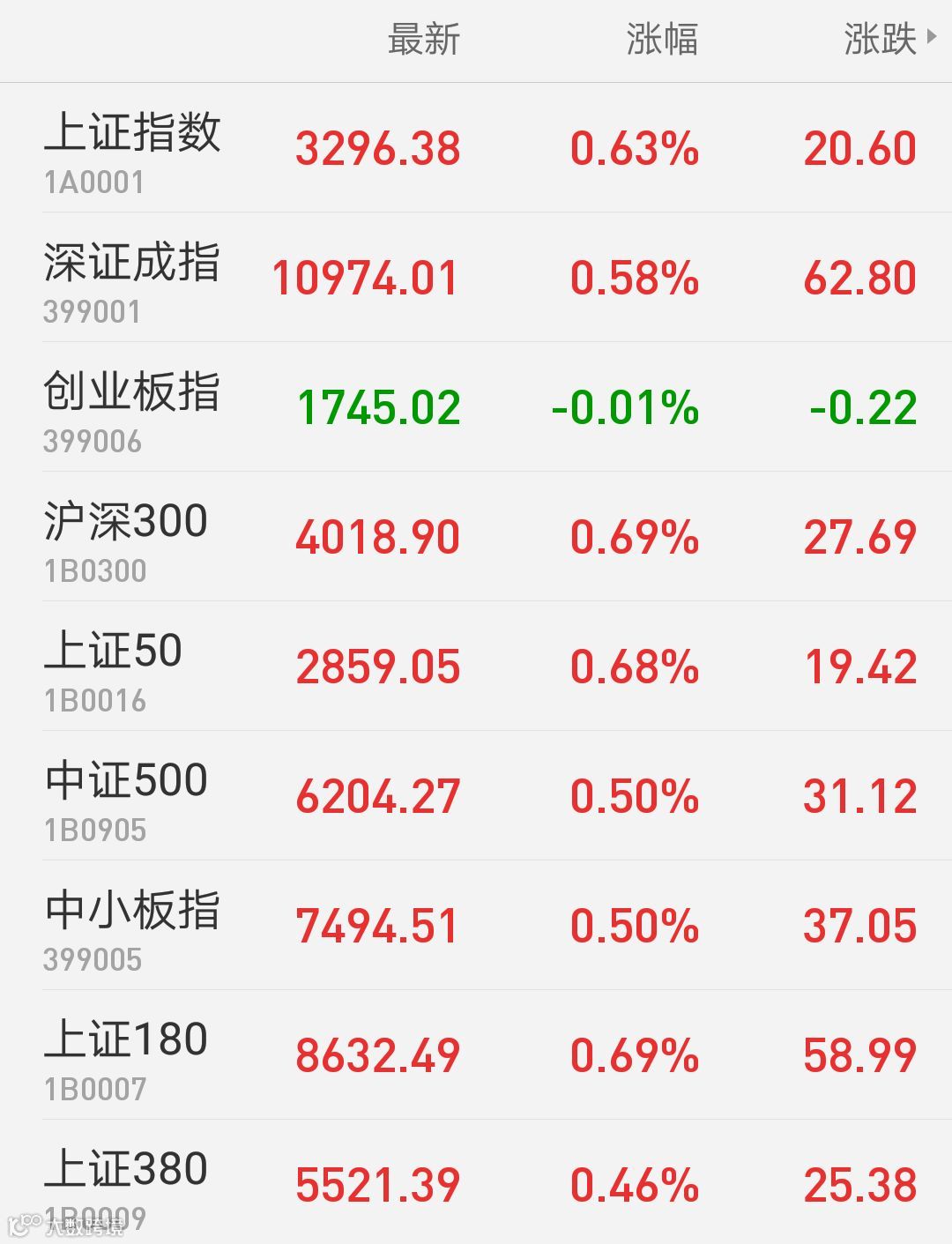 1、A股:上证指数报3296.38点,上涨0.63%,成交额2080.2亿。深证成指报10974.01点,上涨0.58%,成交额2162.91亿。创业板指报1745.02点,下跌0.01%,成交额540.06亿。两市合计成交4243.11亿。从盘面上看,有色金属、钢铁等板块涨幅居前。