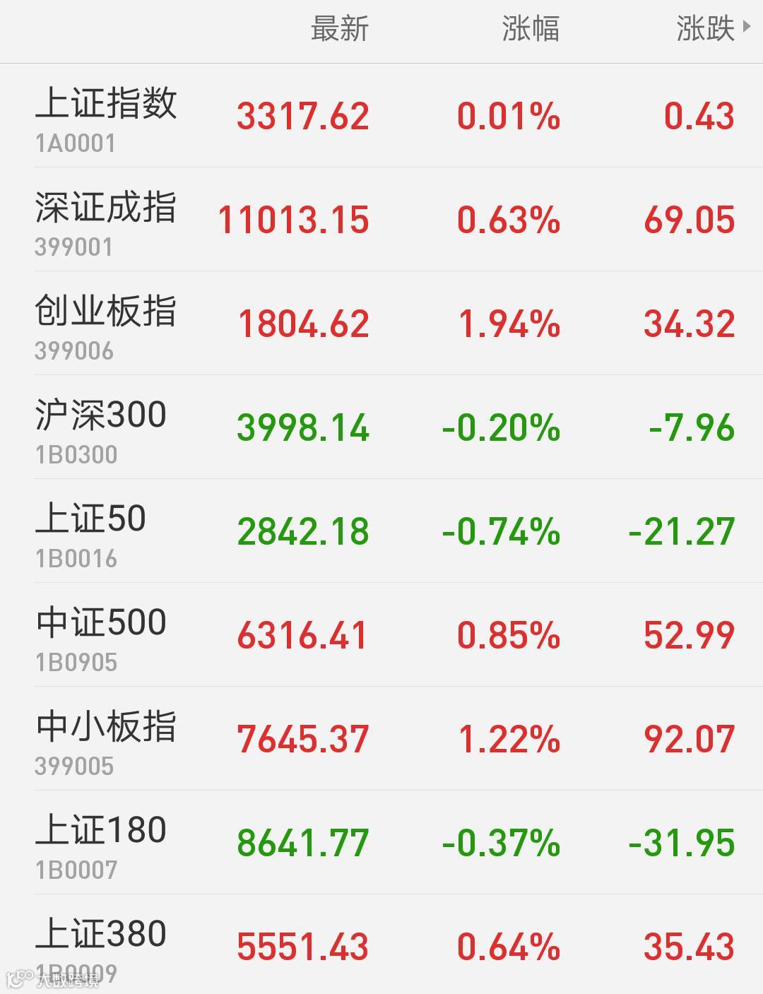 1、A股:上证指数报3317.62点,上涨0.01%,成交额1774.90亿。深证成指报11013.15点,上涨0.63%,成交额2102.21亿。创业板指报1804.62点,上涨1.94%,成交额591.23亿。两市合计成交3877.11亿。从盘面上看,5G概念、国产芯片等板块涨幅居前。