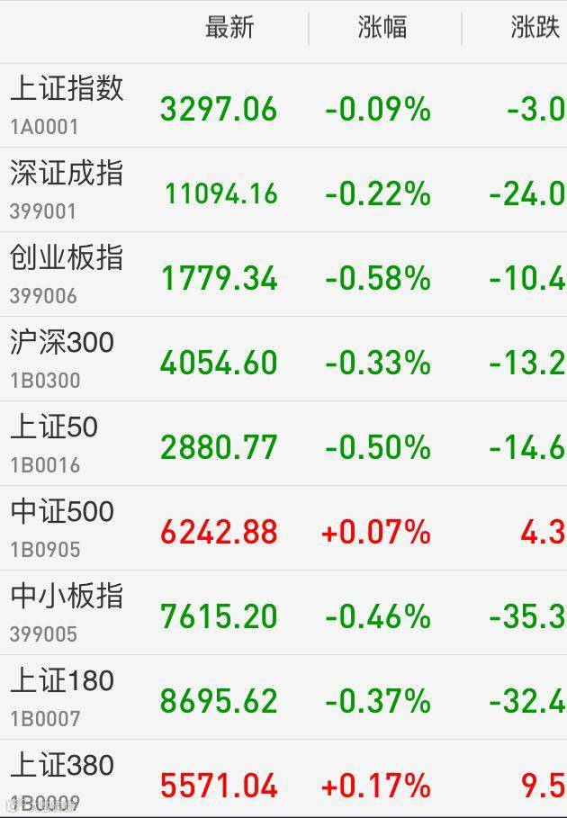 1、A股:上证综指围绕3300点拉锯,收盘跌0.09%报3297.06点;深成指跌0.22%报11094.16点;创业板指数跌0.58%报1779.34点。两市成交3373亿元,创5个月次低。本周沪指涨近1%,结束五周连跌;深成指涨0.87%,连涨两周;创业板指跌0.26%,连跌三周。