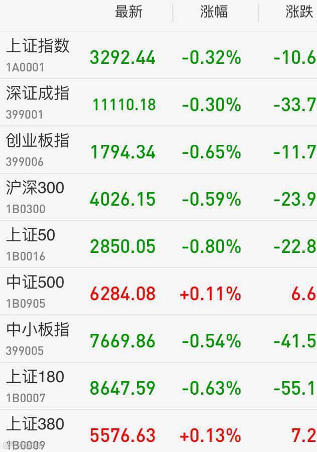 1、A股:上证指数报3292.44点,下跌0.32%,成交额1513.46亿。深证成指报11110.18点,下跌0.3%,成交额2067.27亿。创业板指报1794.34点,下跌0.65%,成交额541.32亿。两市合计成交3580.73亿。从盘面上看,公用事业、钛白粉等板块涨幅居前。