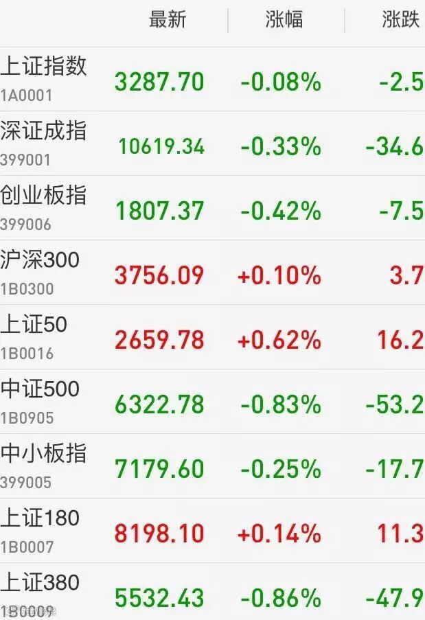 1、A股:上证综指收盘跌0.08%报3287.7点;深成指跌0.33%报10619.34点;创业板指跌0.42%报1807.37点。两市成交4309亿元,上日为4846亿。
