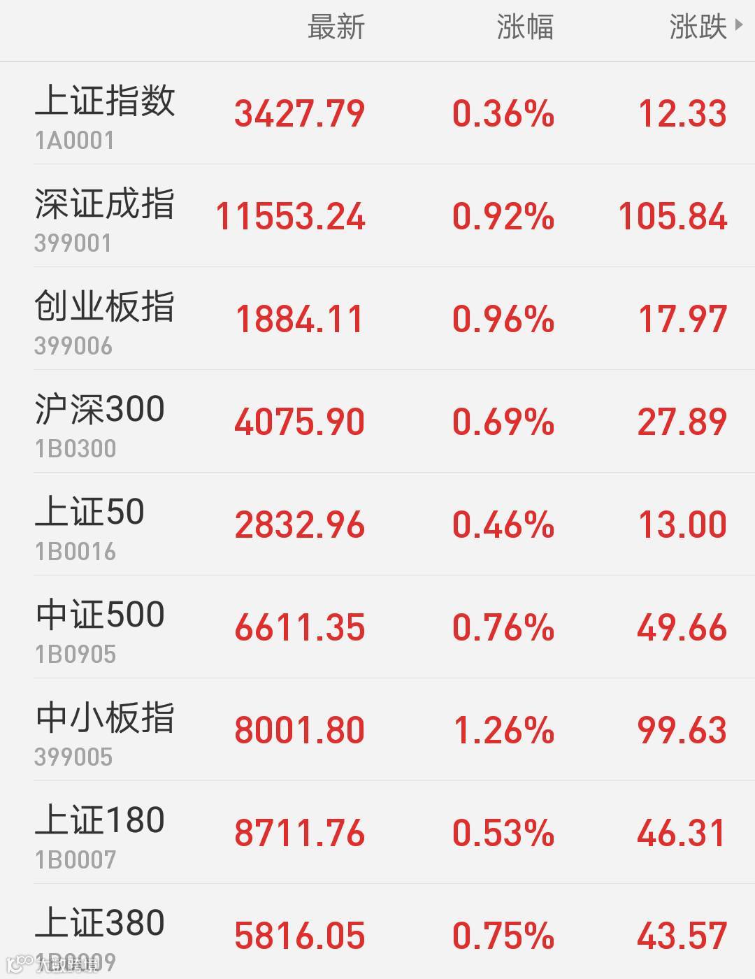 1、A股:上证指数报3427.79点,上涨0.36%,成交额2054.34亿。深证成指报11553.24点,上涨0.92%,成交额2766.9亿。创业板指报1884.11点,上涨0.96%,成交额783.37亿。两市合计成交4821.24亿。从盘面上看,租售同权、国产芯片等板块涨幅居前。