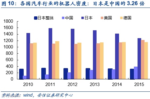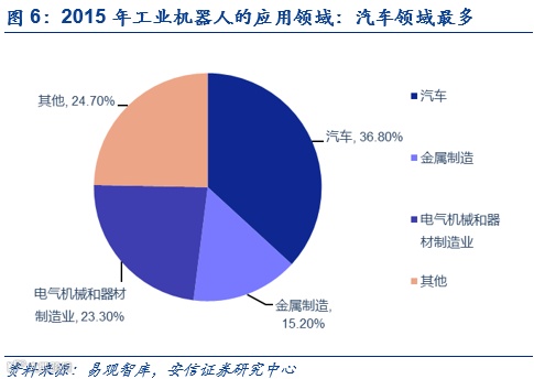 机器人在汽车领域的应用已经比较成熟。日本是汽车领域引入工业机器人技术的尝鲜者。目前日本汽车行业的机器人密度是中国的3.26倍,也是日本整体工业机器人密度的4.18倍。中金产业信息网的数据显示2016年汽车领域使用的工业机器人占总体机器人的39%。由于汽车领域具备标准化和流水线生产的特点,机器人的使用有利于提高产品的标准化。不仅如此,汽车制造业对精度和速度的要求也需要借助工业机器人完成。以焊接机器人为例,汽车制造业对焊接精度和速度等细分指标的要求越来越高,为了满足多车型的市场需求,提高车身车间生产能力的柔性和弹性,焊接机器人广泛运用于汽车行业。中汽协预测2017年的汽车产销量将达到2940万辆,相对于2016年的2803万辆,增长4.9%。在汽车行业需求日益旺盛的背景下,机器人行业也将迎来长足的发展。
