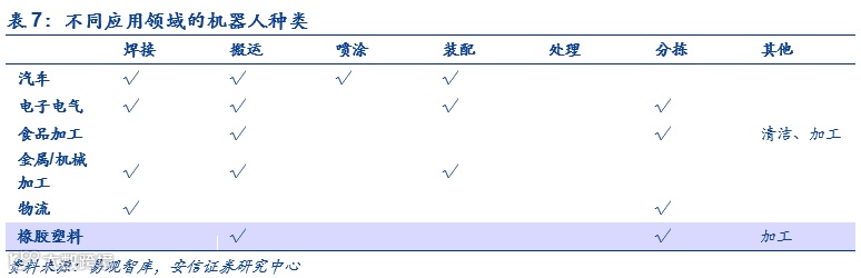 机器人下游的应用场景包括汽车、3C电子、食品加工、物流、橡胶塑料等。不同领域对机器人的功能需求不同,汽车、3C领域以焊接、搬运等为主,物流领域需要机器人完成分拣工作,食品加工领域还需要机器人具备清洁功能。