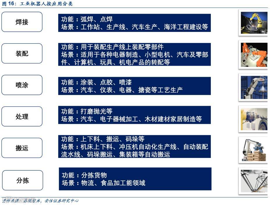 工业机器人是柔性自动化生产及系统集成的基础,而柔性自动化生产及系统集成则是工业机器人商业化应用的关键。系统集成方案解决商负责工业机器人软件系统开发和集成,为终端客户提供应用解决方案。系统集成商并非是标准化程序,而是定制化生产,因此系统集成商的竞争优势主要体现在定制化服务上,其中对客户需求的准确把握是关键。下游的应用包括焊接、装配、喷涂、处理和搬运等,系统集成商通过设定程序,将已经成型的机器人赋予相应的功能。