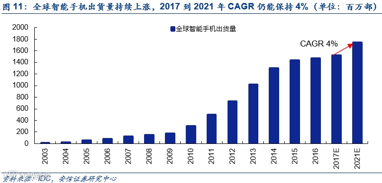 3C市场领域的市场空间在消费升级背景将进一步打开。以手机市场为例,IDC预测2017年到2021年仍将保持4%的年复合增长率。此外,渠道推进、产品创新等因素也将成为刺激3C产品需求增加的关键。GFK数据预测2017年整个中国消费电子市场销售金额将达到2万亿的规模,预计增长7.1%,远超全球3%的增长速度。3C领域作为机器人第二大应用市场,其产销量的增加会进一步打开机器人的市场。