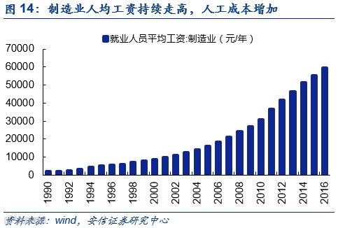 机器人相对于工人的优势还体现在应用范围广。机器人可以运用在危险、恶劣的环境下作业。如点焊机器人、切割机器人可以完成危险的电焊、切割工作;搬运机器人搬运有害物料。近年来制造业工人工资不断攀升,而由于高危行业除了高企的工人工资还有福利保障等支出,对企业造成较大的成本负担。机器人在高危行业的使用可以减轻企业负担。