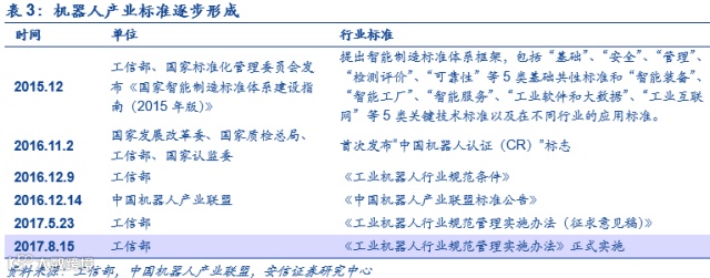 工信部等国家部位以及机器人产业联盟等行业组织对机器人零部件的产品标准规范有利于提高产业的标准化。标准化包括零部件的标准化,本体的标准化以及下游集成的标准化。产业的标准化可以提高单机与产线的匹配度。