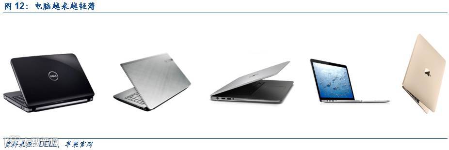 其次是产品精细化、轻薄化的需求增加。近年来3C产品的轻薄化趋势愈加明显。以笔记本为例,电脑从原本的厚重型逐渐演变为目前的轻薄型,2015年苹果率先推出当时世界上最轻薄的笔记本Macbook,最厚处仅1.3厘米,最薄处2毫米,此后各品牌竞相推出轻薄型产品,背后折射出产品的先进、高端和品质化程度越来越高。3C产品的精细化做工需求提高也意味着对加工设备,即机器人的需求也在增加。