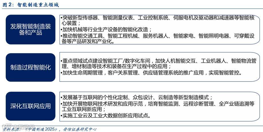 目前我国处于机械化、电气化、自动化、数字化并存阶段,加快制造业升级,抛弃低端生产方式是必然趋势。但是这并不意味着一步登天,技术发展和升级是一个循序渐进的过程,同时也是一个积累的过程。《中国制造2025》中着重发展的三大领域包括智能制造装备和产品、制造过程智能化和深化物联网应用,这三者在政策层面上虽是并驾齐驱,但本质上存在前后发展的关系。智能制造装备是三者的基础,也是三者的实现终端,智能制造装备产业包括高档数控机床、工业机器人、自动化成套生产线、精密仪器仪表、智能传感器、汽车自动化焊接线、柔性自动化生产线、智能农机、3D 打印机等领域。而智能制造装备中工业机器人是关键。工业互联网是通过端上的数据传输,经过大数据分析和云计算处理,再进行智能化决策的一整个过程,其中端的数据传输是基础。工业互联网的端包括机器人、传感器等一切线下连接端口。因此发展工业机器人是实现工业互联网的基础,也是第一步。