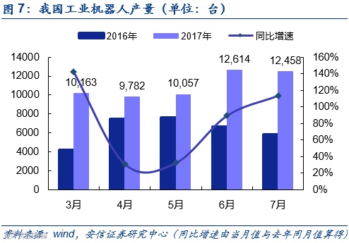 国产机器人服务的行业达到34个国民经济行业大类,91个行业中类,服务行业继续扩大。IFR统计数据显示中国工业机器人销量9万台,同比增长31%。今年以来国产机器人需求迎来爆发式的增长,需求量一直保持着持续增长的势头。今年7月份国内工业机器人产量高达12458万台,同比增长113%。今年上半年国内工业机器人产量达到59097台(套),同比增长52.3%(资料来源;21世纪经济报),快速上涨趋势明显。