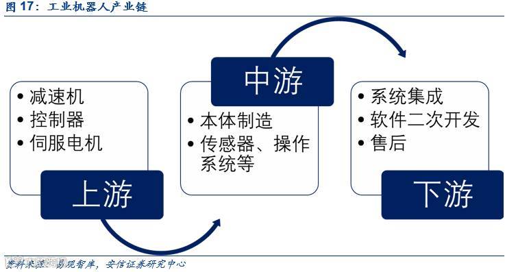 工业机器人的产业链分为上游核心零部件,中游本体和传感器等生产,以及下游的系统集成等。核心零部件是减速机、伺服系统、控制系统三部分,分别对应执行系统、驱动系统、控制系统,分别占成本的35%、25%和 15%左右。(资料来源:克来机电招股说明书)。