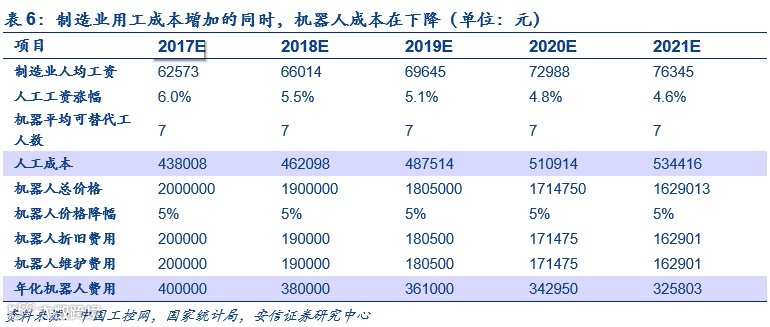 机器人技术的成熟体现在现有技术的运用成本降低以及高端技术的突破。对于现有工艺的熟练把握降低了机器人制造成本。在用工成本不断增加,机器人工艺成熟降低成本的的情况下,机器人的实用性将渐趋升高。我们对工业机器人对人工的替代性进行了测算(见表6)。根据中国工控网假设,一台大型焊接机器人,初始购置成本200万,三班倒计算可代替7个工人。根据日经中文网的调研数据显示工业机器人的平均使用期限是10年,我们假定每年的维护和折旧费用均为总费用的十分之一。根据Ofweek的数据显示,目前机器人的价格以每年的5%的速度下降。国家统计局统计的近几年制造业城镇单位就业人员工资情况表明工资增速放缓,2014年和2015年的增速分别为10.6%和7.7%,后续会进一步放缓。我们以边际递减速度放缓来估计之后几年的工资增长情况。从2017年开始,机器人使用成本既可以低于人工成本。