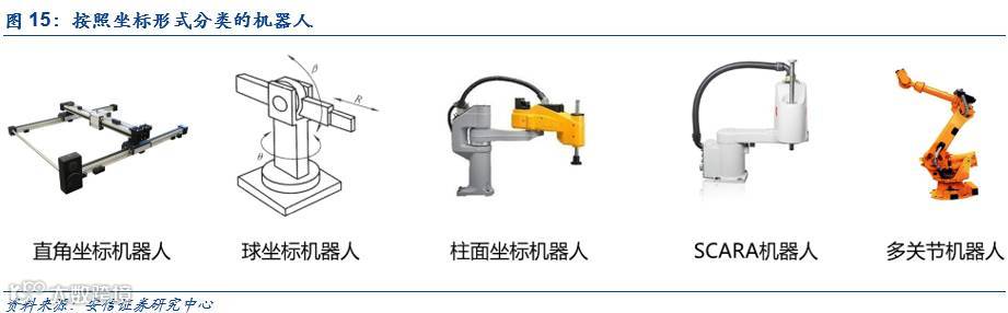 按照坐标形式分类,可以将机器人分成直角坐标型、圆柱坐标型、球坐标型和关节型四类。直角坐标型的臂部可沿三个直角坐标移动;圆柱坐标型的臂部可以完成升降、回转和伸缩动作,具有一个旋转轴和两个平移轴;球坐标型的臂部能回转、俯仰和伸缩,具有两个旋转轴和一个平移轴;关节型的臂部有多个转动关节,其中又可以细分为平面关节和多关节机器人,通常由大小两臂和立柱等机构组成,大小臂之间用铰链连接形成肘关节。