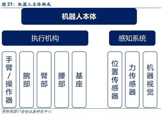 机器人本体制造商负责工业机器人执行机构和感知系统与核心部件的生产加工组装后,交由下游厂商生产。本体企业在整个产业链中起到了整合上下游的作用。本体生产包括手臂、腕部、臂部、腰部、基座等部件生产组装,还包括位置传感器、力传感器和机器视觉等感觉系统。也正是因为机器人的多个传感器功能,保证了机器人在工业互联网构建中的“端”位置。