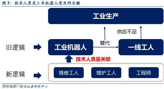 市场通常关注一线工人供应不足对工业机器人需求的刺激作用。我们认为,比起需求的不断提升,供给端瓶颈的突破更加值得重视。除了上文提到的关键技术突破之外,目前的正在突破的一大瓶颈在于技术人员的供给。机器人的生产涉及到的有机器人厂商的高级工程师,机器人运行中的维护人员,以及之后的售后保障人员,三者的费用在机器人替代过程中占据较高的费用。之前由于三方面人才的缺失,导致机器人的研发和运营成本高企不下、中小企业“不敢用”机器人的情况经常出现。