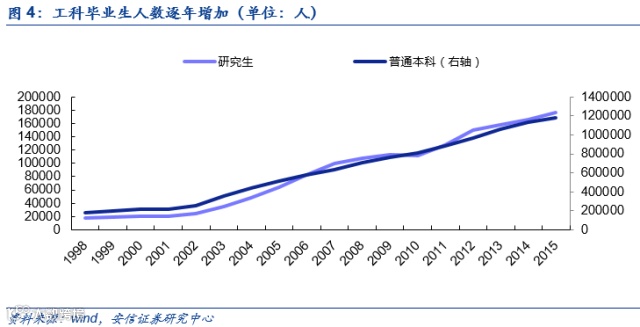 近年来我国工科毕业生数量呈现持续上升趋势,为机械工程师行业输送大量优质人才。在我国工程师薪酬远低于国外的基础上,叠加高水平工程师数量增加的优势,为我国工业机器人研发提供了高素质人才和低成本的双重优势。近年来,高校开设的机器人专业数量增加,同时相关领域领域的研究性人才也在不断向企业输出:1.机器人专业方面:教育部公布的《2016年度普通高等学校本科专业备案和审批结果》发现,有超过20家高校新增了“机器人工程”专业;2.以硕博士毕业论文为例,从2001年到2015年硕博士论文题目和关键词中带有“机器人”字样的博士生论文有2352篇,硕士生论文有18580篇。此外,在今年的6月28日,全国工业机器人职业岗位工程师培养项目正式启动,也意味着我国工业机器人领域的专业人才会进一步增加。