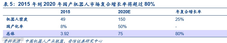 根据机器人规划,到2020年,中国自主研发工业机器人年产量达到10万台,密度达到150以上,根据2015年工业机器人密度为49,可得工业机器人在未来将以25%的复合增长率增加。同时在国产化率提高的基础上,我国国产机器人的复合增长率将达到80%。叠加随着工艺和技术成熟带来的生产成本降低,预计到2020年我国国产机器人利润复合增长率将超过80%。